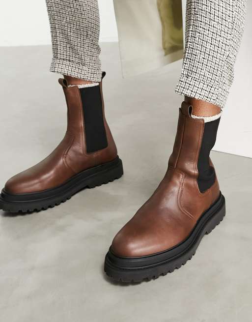 ASOS DESIGN high chelsea calf boots on stacked sole in brown leather