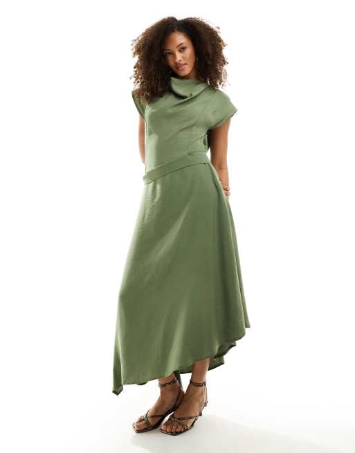 ASOS DESIGN high neck asym hem midi dress in khaki