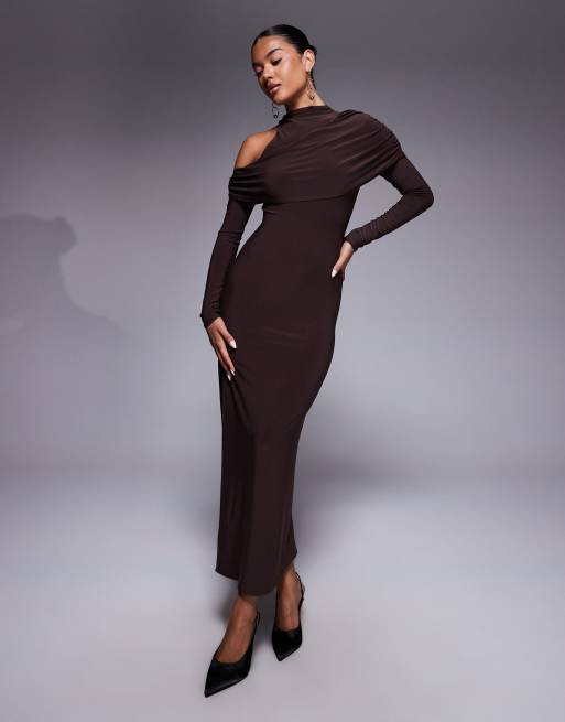 ASOS DESIGN high neck aysm cold shoulder midi dress in chocolate