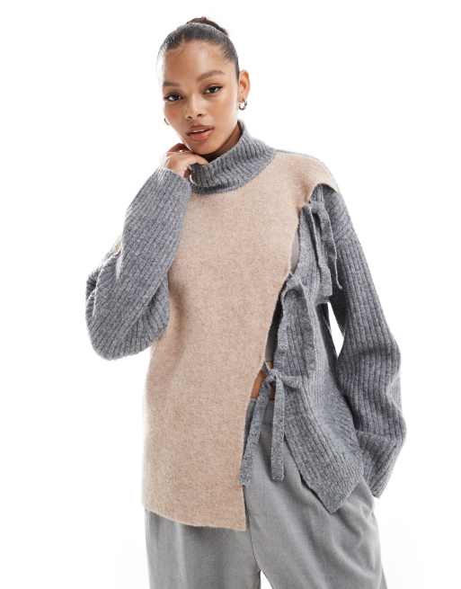 ASOS DESIGN high neck jumper with tie detail and colour block in neutral