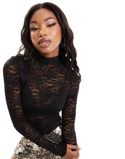 ASOS DESIGN high neck long sleeve lace bodysuit in black