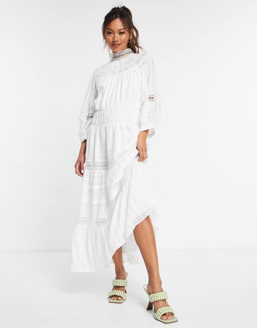 ASOS DESIGN high neck midi dress with lace inserts in grid texture in white