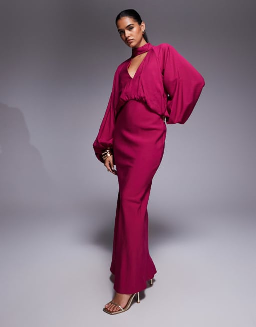 ASOS DESIGN high neck plunge maxi dress with blouson sleeves in raspberry