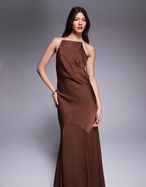 ASOS DESIGN high neck satin bias fishtail maxi dress in brown