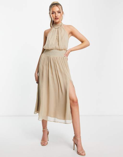 ASOS DESIGN high neck soft midi dress with shirred waist detail in stone
