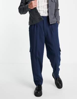 ASOS DESIGN high waist slim cargo smart trouser in navy stripe