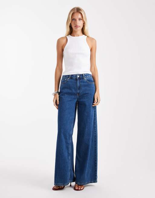 ASOS DESIGN high waist wide leg jeans in midwash blue
