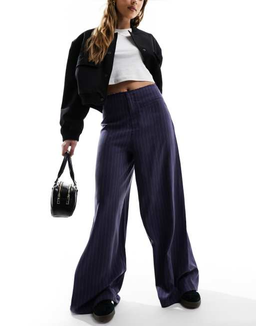 ASOS DESIGN high waisted wide leg trouser trouser with raw edge detail in navy stripe