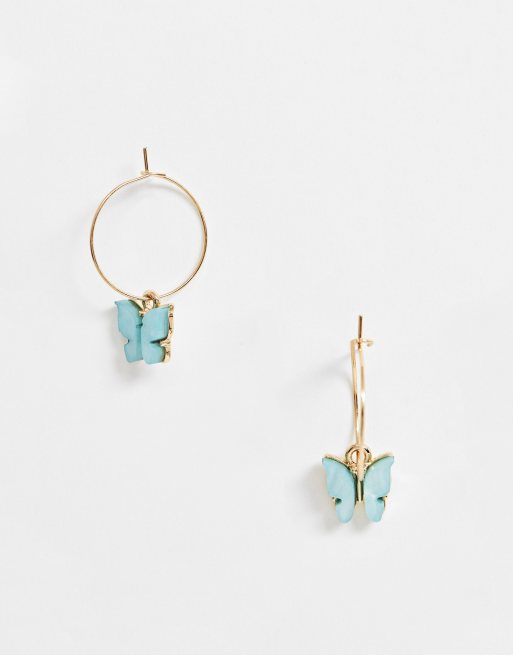 ASOS DESIGN hoop earrings with blue butterfly charm in gold tone