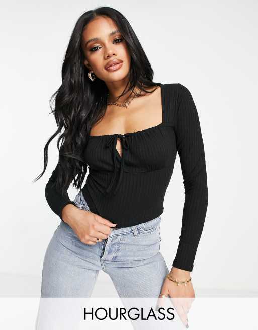 ASOS DESIGN Hourglass ribbed square neck top with tie detail in black