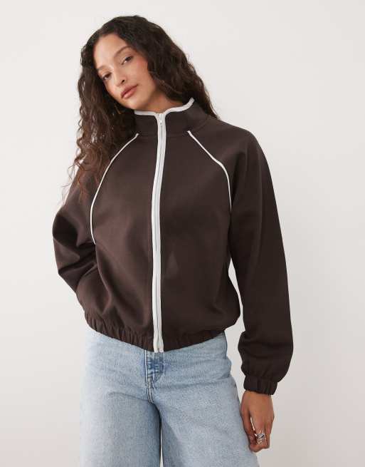 ASOS DESIGN interlock funnel neck zip through jacket with contrast piping in chocolate