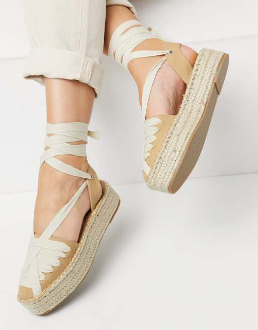 ASOS DESIGN Junior flatform espadrilles with ankle tie in tan/cream