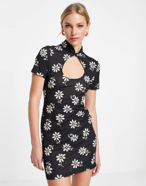 ASOS DESIGN keyhole mini dress in black and cream daisy print