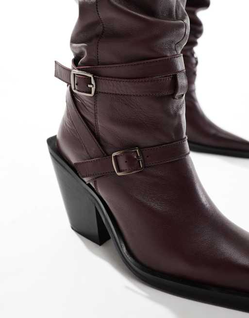ASOS DESIGN Kingfisher leather ruched over the knee boots with buckles in burgundy