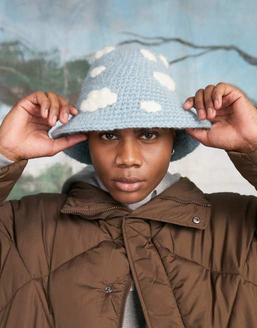 ASOS DESIGN knitted bucket hat in blue cloud design