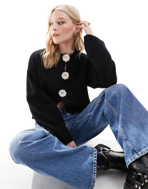 ASOS DESIGN knitted cardigan with contrast flower corsages in black