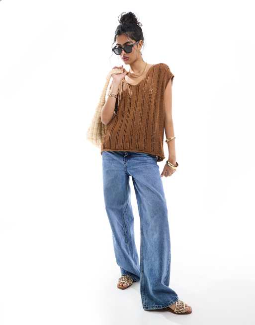 ASOS DESIGN knitted collar tank in open stitch in brown