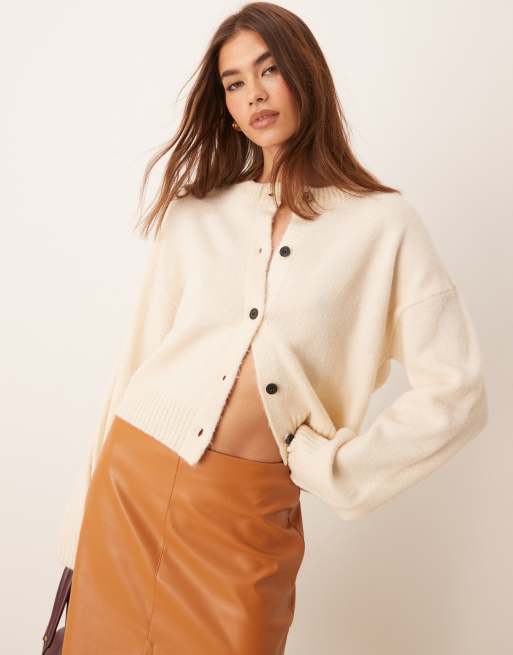 ASOS DESIGN knitted crew neck cardigan with contrast black buttons in cream