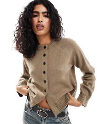 ASOS DESIGN knitted crew neck cardigan with contrast buttons and split hem in mocha