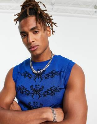 ASOS DESIGN knitted crew neck tank in blue with tattoo design