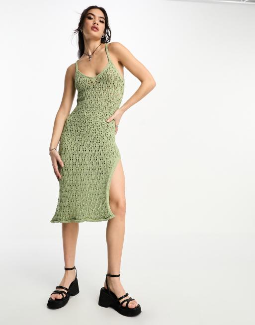ASOS DESIGN knitted crochet midi dress in open stitch in khaki