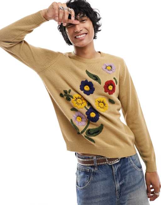 ASOS DESIGN knitted jumper with floral hand embroidery in tan