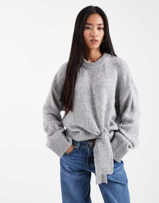 ASOS DESIGN knitted jumper with tie hem detail in grey