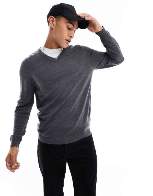 ASOS DESIGN knitted merino wool v- neck jumper in grey