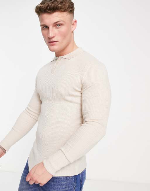ASOS DESIGN knitted muscle fit rib polo jumper in oatmeal