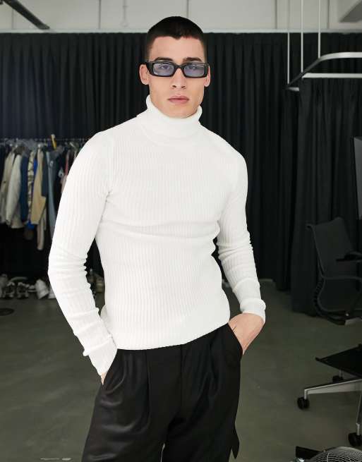 ASOS DESIGN knitted muscle fit rib roll neck jumper in white