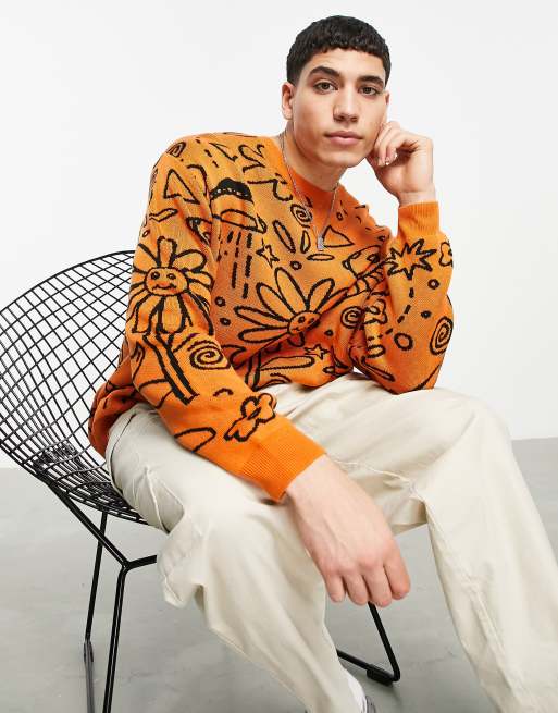 ASOS DESIGN knitted oversized jumper with doodle design in orange