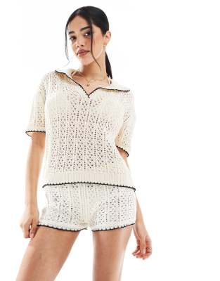 ASOS DESIGN knitted polo top co-ord with contrast blanket stitch in ivory