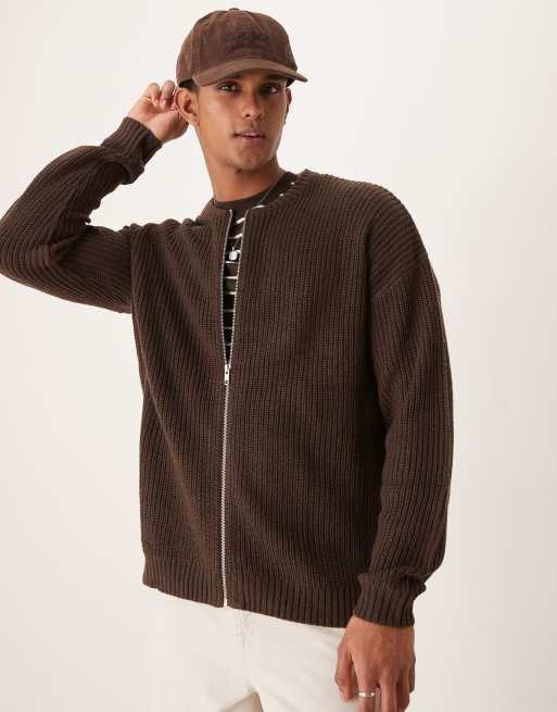 ASOS DESIGN knitted relaxed fisherman rib zip up bomber in brown