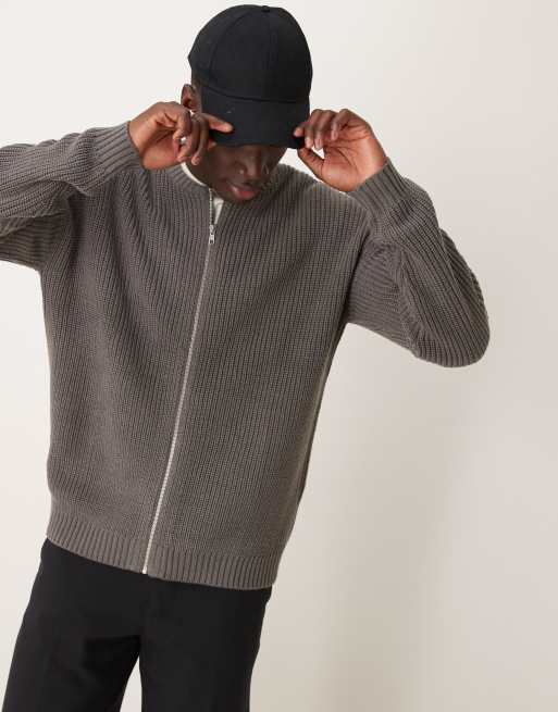 ASOS DESIGN knitted relaxed fisherman rib zip up bomber in grey marl