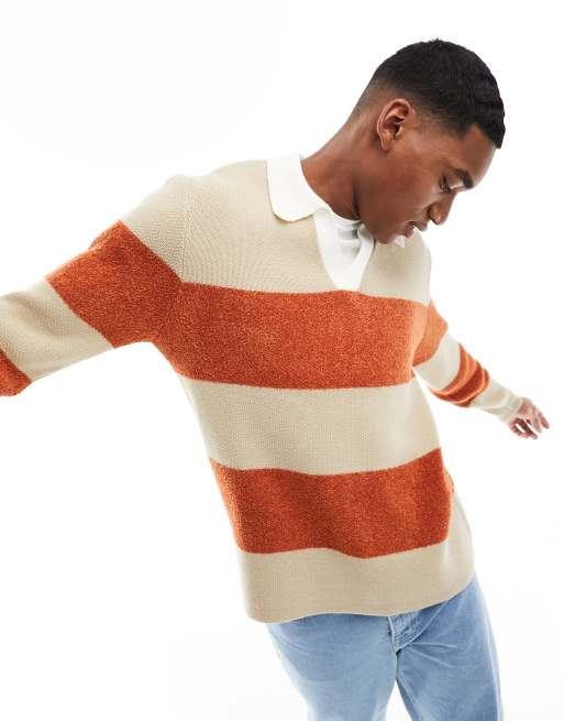 ASOS DESIGN knitted relaxed rugby striped textured jumper in orange and white - ORANGE