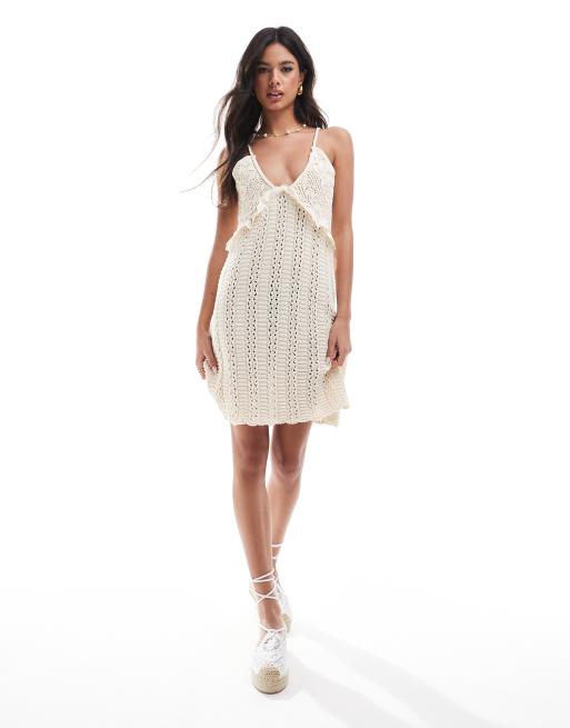 ASOS DESIGN knitted strappy mini dress with broderie trim in cream