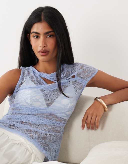 ASOS DESIGN lace asymmetrical top with twist neck and cap sleeve in blue