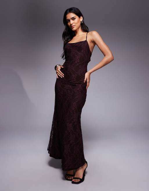 ASOS DESIGN lace square neck cami maxi dress with tie back in chocolate