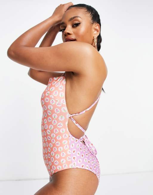 ASOS DESIGN lace up strappy swimsuit in mixed ditsy floral print