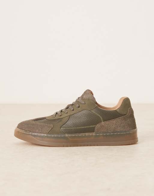 ASOS DESIGN lace up trainers in khaki leather with suede panels and gum sole