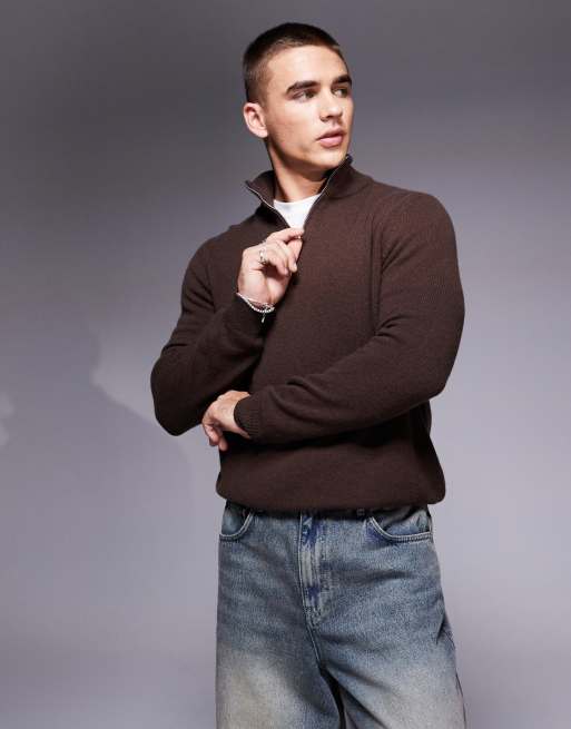 ASOS DESIGN lambswool quarter zip knitted jumper in brown