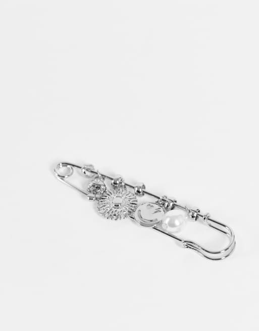 ASOS DESIGN lapel pin with charms and faux pearl in silver tone