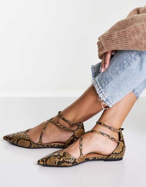 ASOS DESIGN Larna pointed ballet flats in tan snake