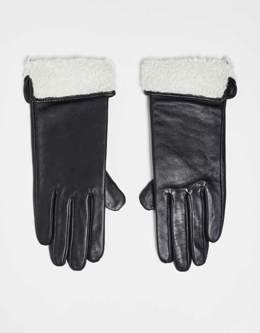 ASOS DESIGN leather gloves with touch screen with borg cuff in black