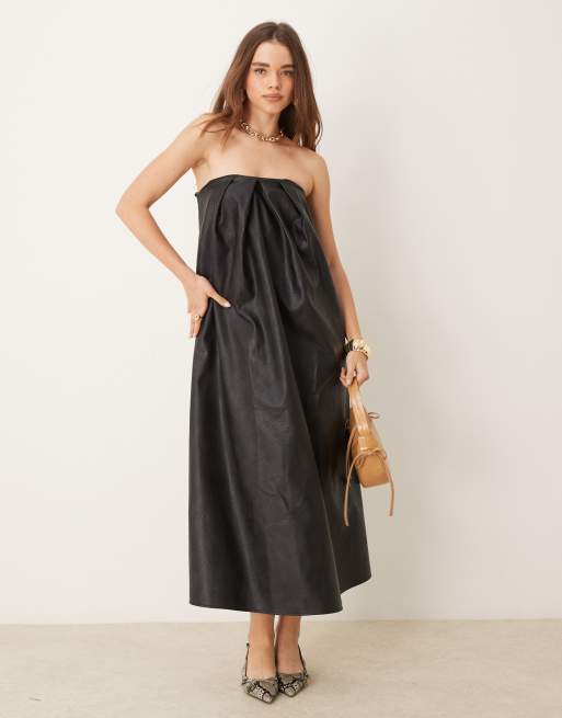 ASOS DESIGN leather look bandeau trapeze midi dress in black