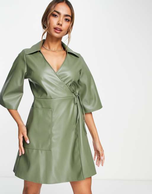ASOS DESIGN leather look wrap mini dress with pocket in olive