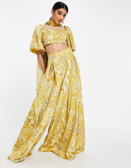 ASOS DESIGN Lehenga trouser co-ord set in yellow leaf print