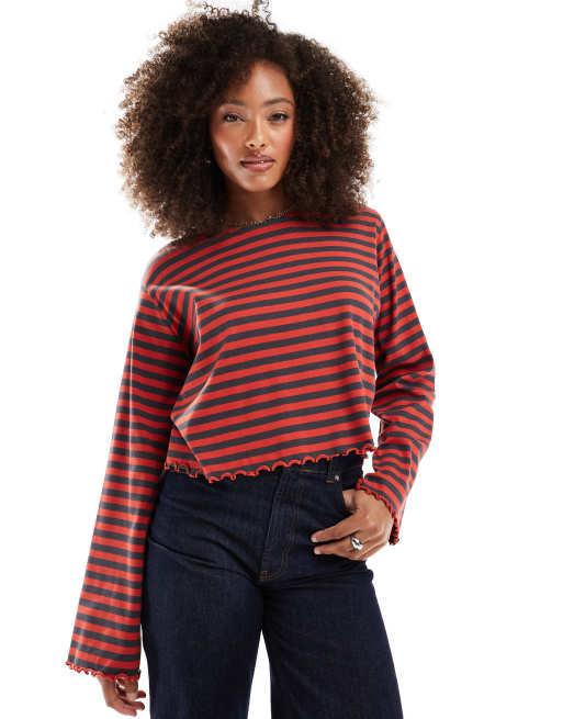 ASOS DESIGN lettuce hem long sleeve t-shirt in red and grey stripe