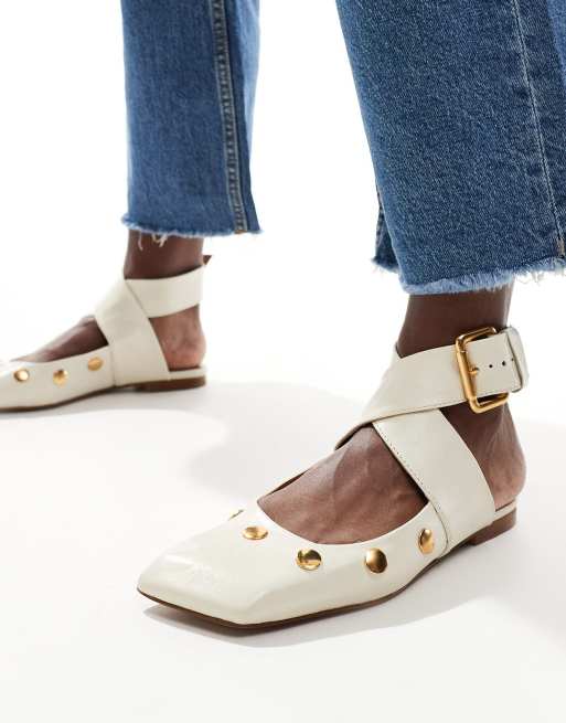 ASOS DESIGN Level premium leather studded ballet in off white