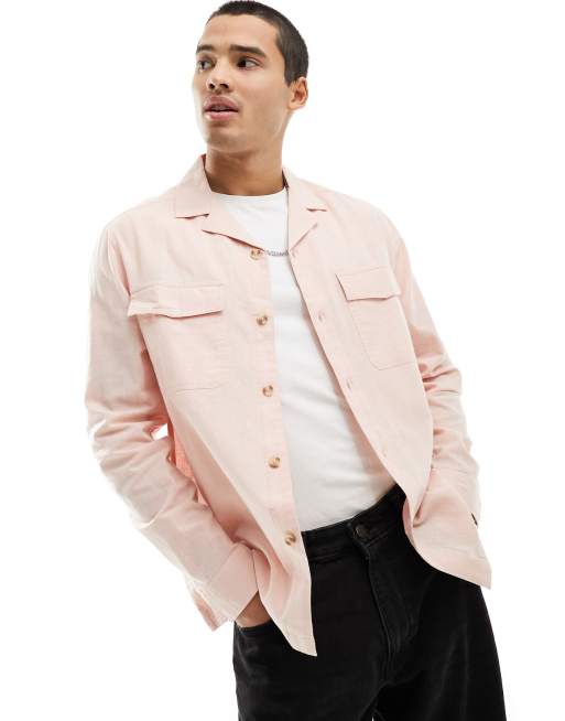 ASOS DESIGN linen blend revere collar overshirt with double pockets in light pink